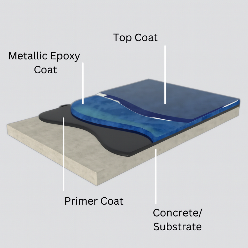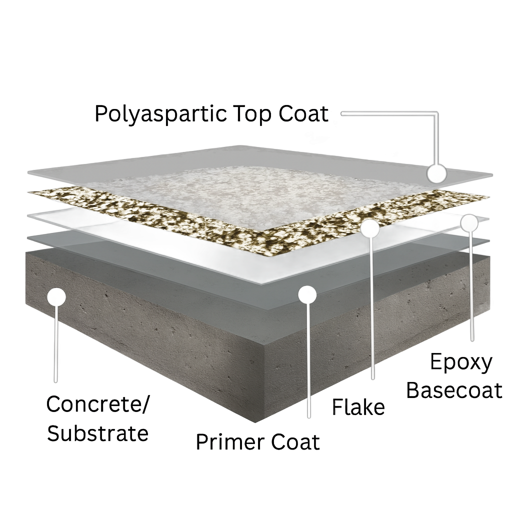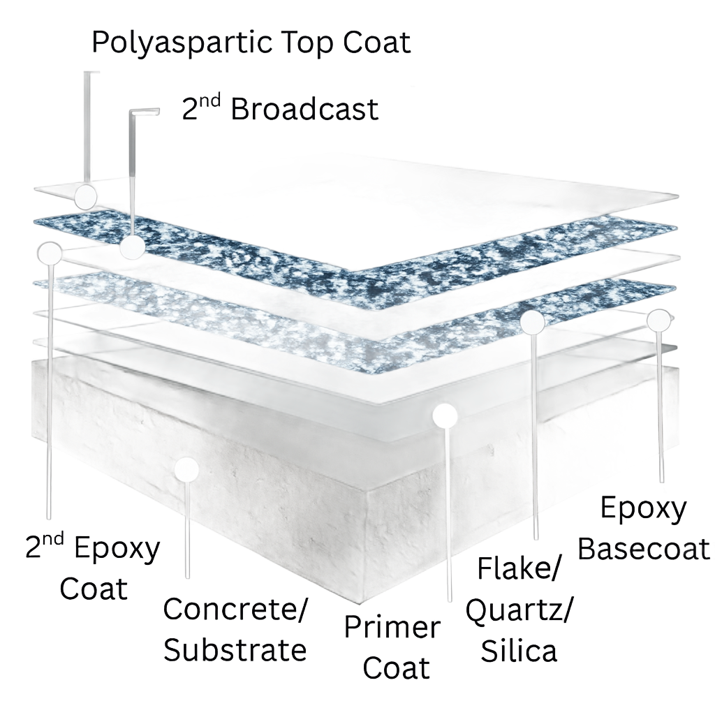 We offer a full range of epoxy floor coating systems designed for durability, performance, and visual impact. Our options include solid-color epoxy for clean, modern finishes; decorative flake systems for added texture and slip resistance; quartz systems for enhanced strength and moisture control; and metallic epoxy for a bold, high-end appearance. Each system is built on a properly prepared substrate with an epoxy primer and base coat, finished with a polyaspartic or urethane topcoat for long-lasting protection, chemical resistance, and easy maintenance.